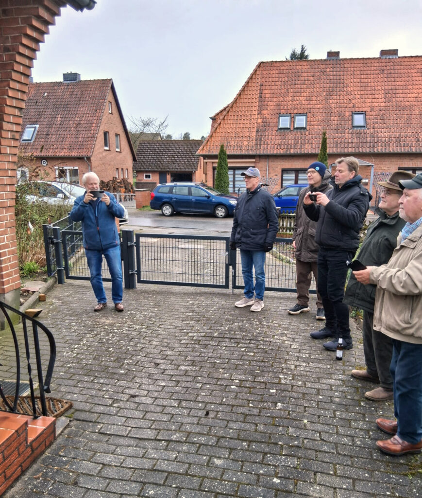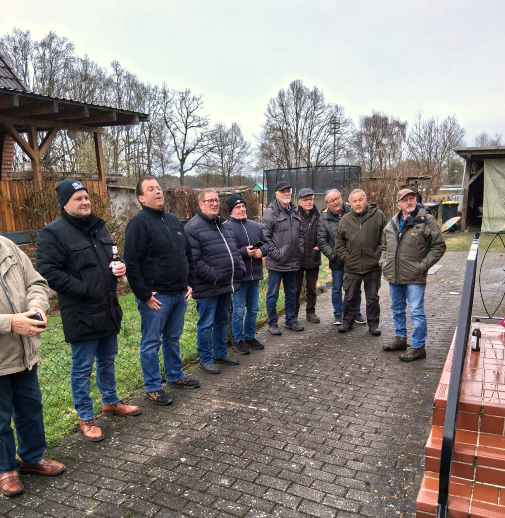 Jeder »König der Könige« erhält eine Ehrenscheibe; dies liefert nun wieder genug Anlass, sich im Dorf noch einmal zum Scheibeaufhängen zu treffen. Unser »König der Könige« 2025 , Mathias Böhnke, lud nun zum Aufhängen seiner Scheibe zu sich nach Hause ein. Zahlreiche ehemalige Könige sind gerne der Einladung gefolgt, um bei der „zeremoniellen“ Aufhängung dabei zu sein.